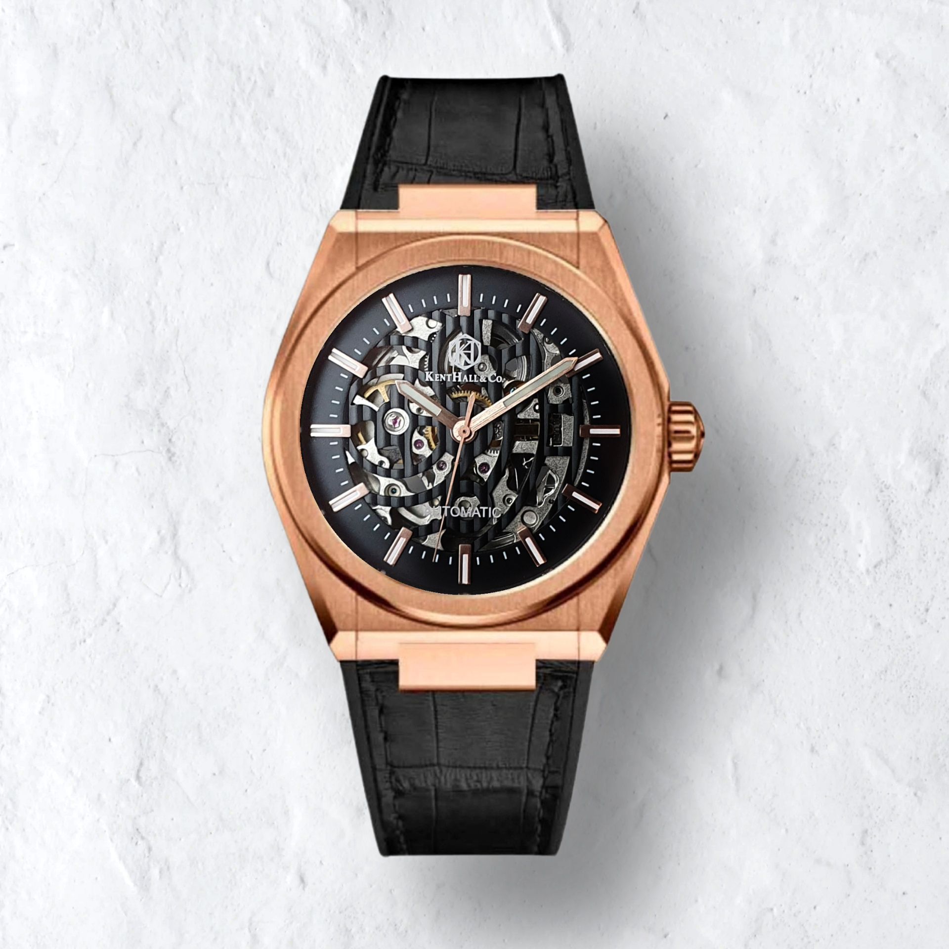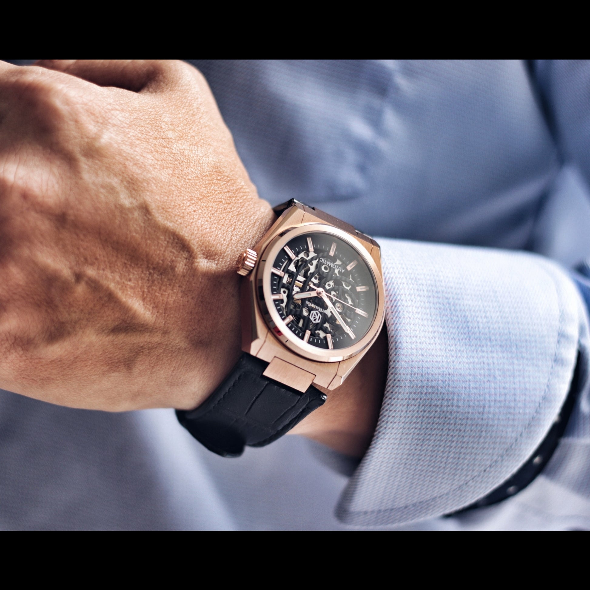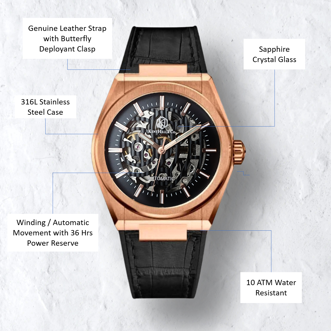 The Aurelia - Black Leather watch features a striking skeleton dial, encased in 316L stainless steel case and matched with a black leather strap with deployant buckle. Part of the Nova Skeleton series, the timepiece is powered by an automatic movement with up to 36 hours of power reserve. The movement can be wound and is further powered by your kinetic movements such that you will never need to change batteries. Protected by 10 ATM water resistance and topped with ultra scratch-resistant sapphire crystal glass, this statement piece is a pleasure to behold.