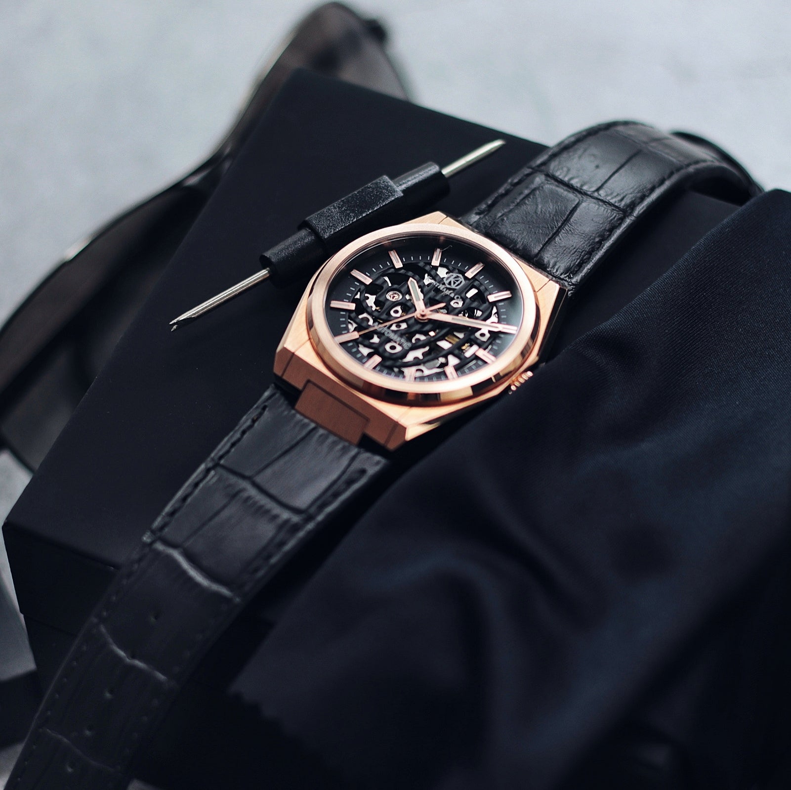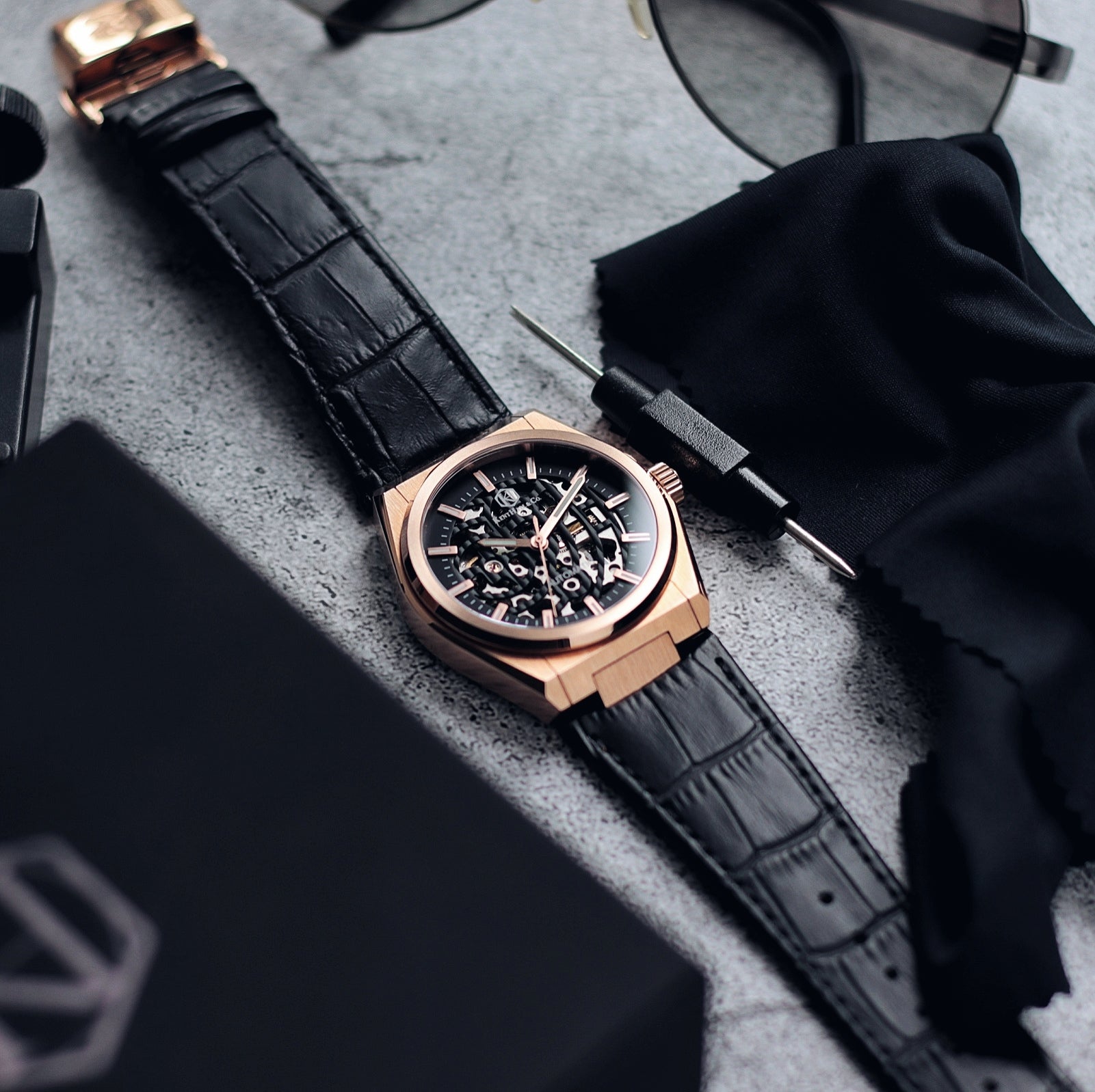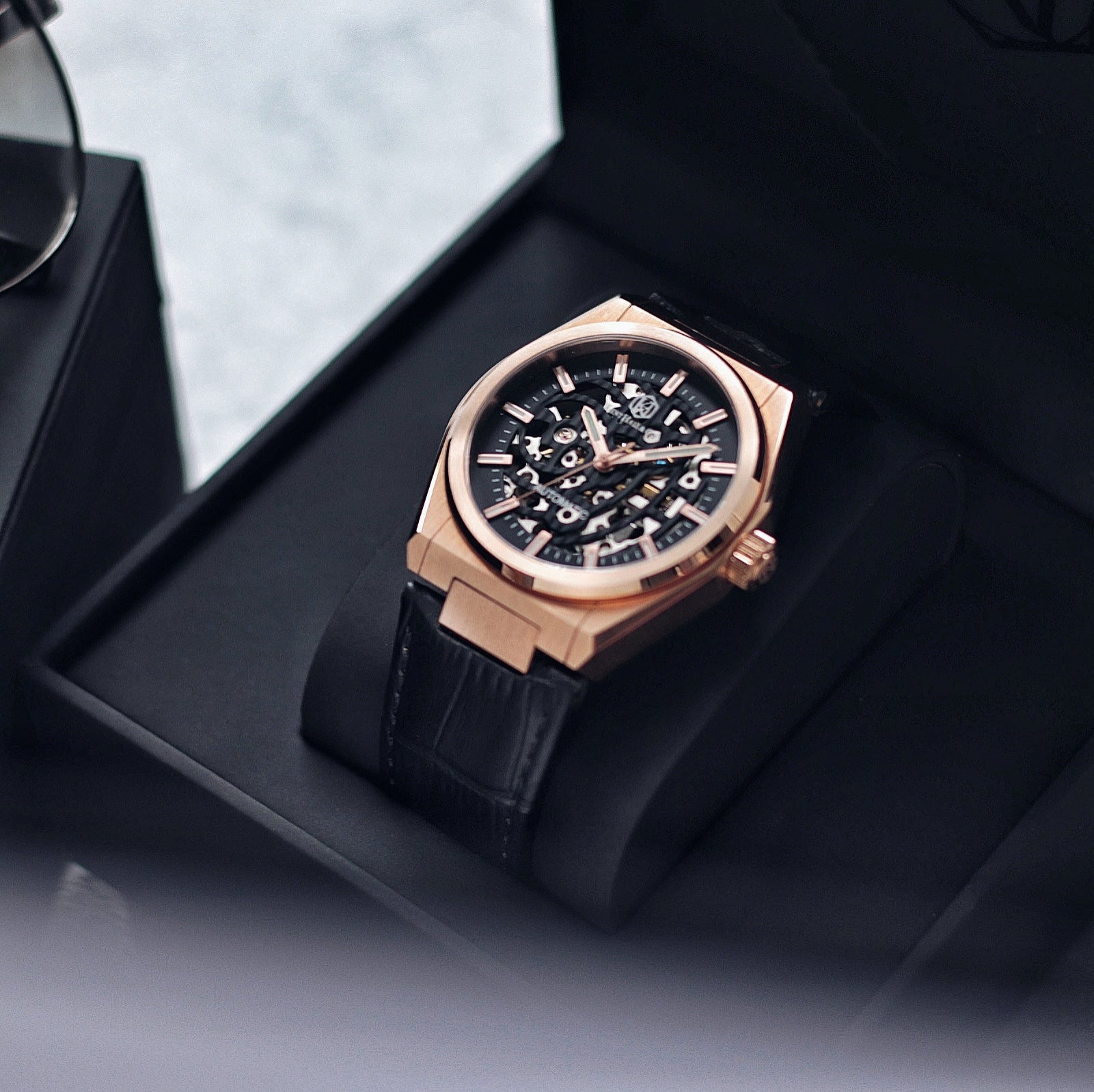 The Aurelia - Black Leather watch features a striking skeleton dial, encased in 316L stainless steel case and matched with a black leather strap with deployant buckle. Part of the Nova Skeleton series, the timepiece is powered by an automatic movement with up to 36 hours of power reserve. The movement can be wound and is further powered by your kinetic movements such that you will never need to change batteries. Protected by 10 ATM water resistance and topped with ultra scratch-resistant sapphire crystal glass, this statement piece is a pleasure to behold.