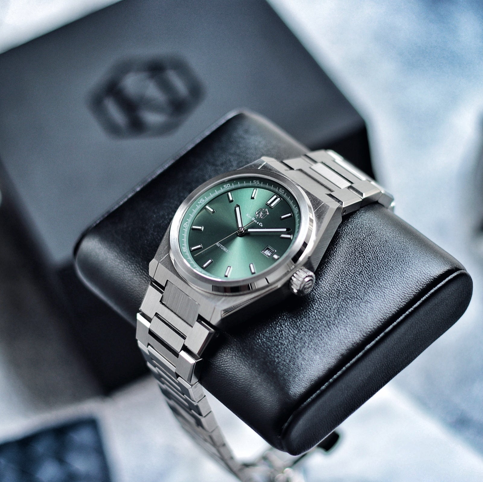 The Nova series features a clean radial sunray dial, providing a minimalist and classic aesthetic. Each Castleton Steel timepiece is powered by a Japanese automatic movement (Seiko NH35A), with up to 41 hours of power reserve. The understated dial is contrasted with applied indices, providing greater legibility. The watch is powered by your kinetic movements such that you will never need to change batteries. Encased in surgical stainless steel, protected by 10 ATM water resistance and topped with ultra scratch-resistant sapphire crystal glass, this statement piece is a pleasure to behold.