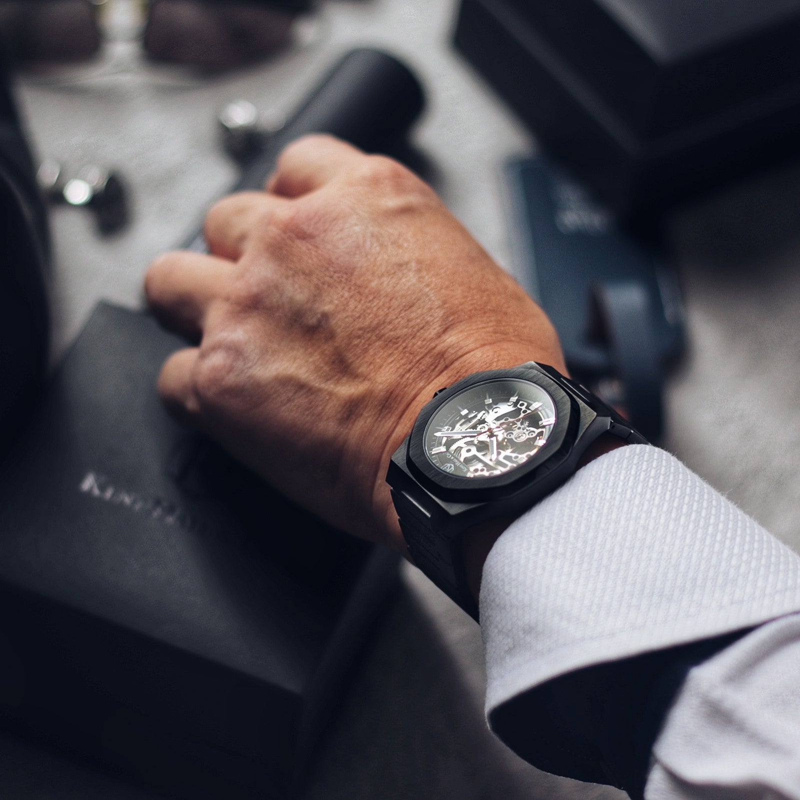 ✔ Sapphire Crystal Glass. Ultra scratch-resistant sapphire crystal glass allows you to marvel at the full mechanics of the timepiece without worries of scratching the surface.