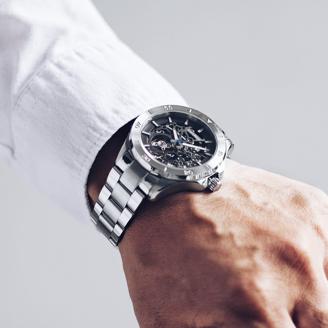 Each Liberty timepiece is powered by a skeletonised Seagull automatic movement, with 36 hours of power reserve. The watch is powered by your kinetic movements and by winding the crown, such that you will never need to change batteries. Encased in surgical stainless steel, protected by 5 ATM water resistance and topped with ultra scratch-resistant sapphire crystal glass, this bold statement piece is a sight to behold.