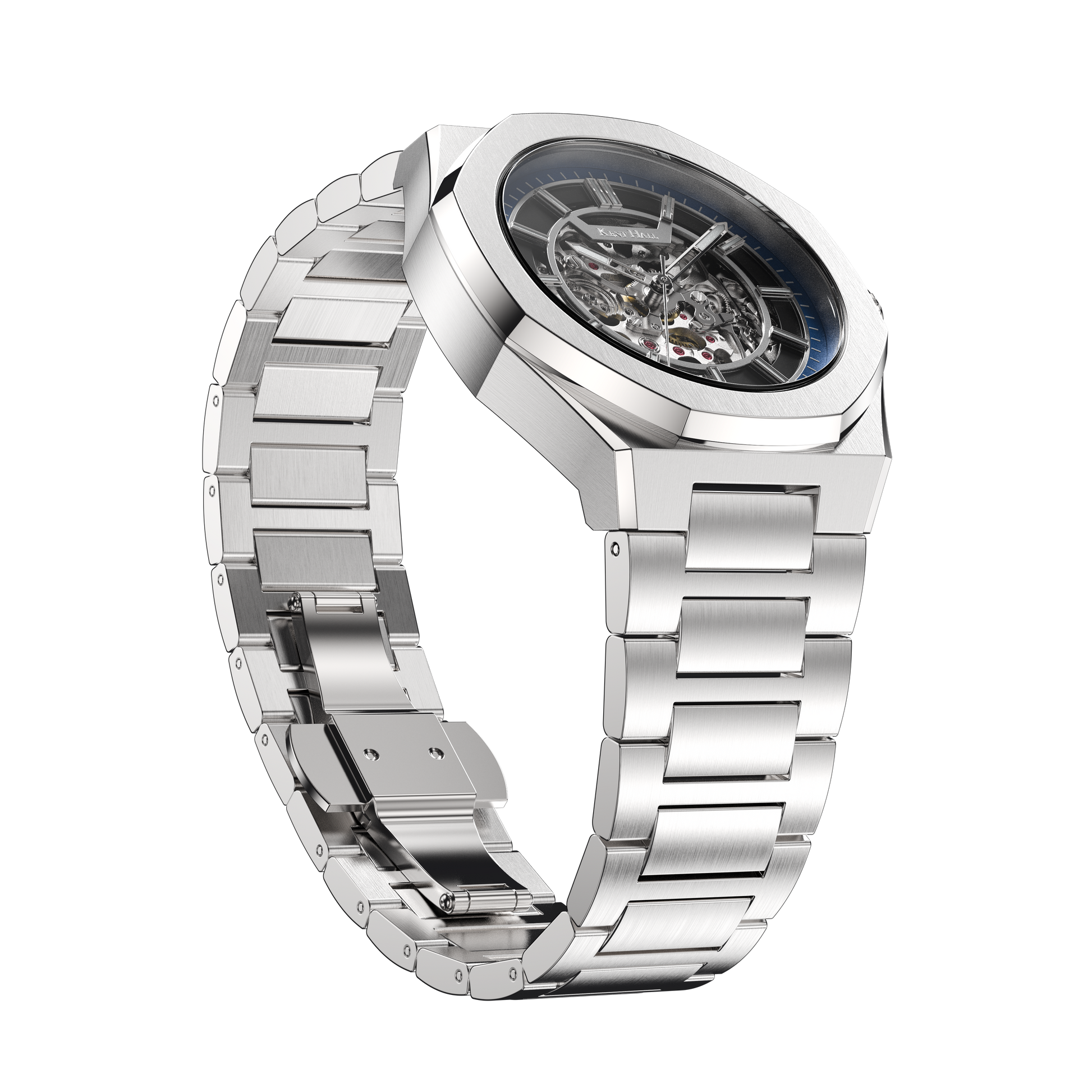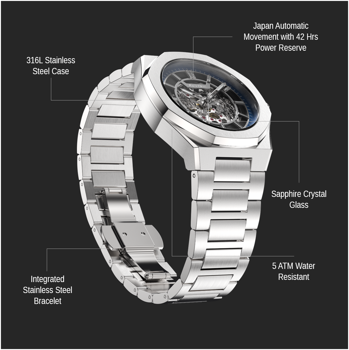 Expertly crafted with a contemporary urban aesthetic, the Philosopher Steel watch boasts a stainless steel construction with a scratch-resistant sapphire glass. Featuring a skeleton watch design and powered by a reliable Japan automatic movement with 42 hours of power reserve, it offers both style and functionality. Elevate your timepiece collection with this sleek and sophisticated watch.
