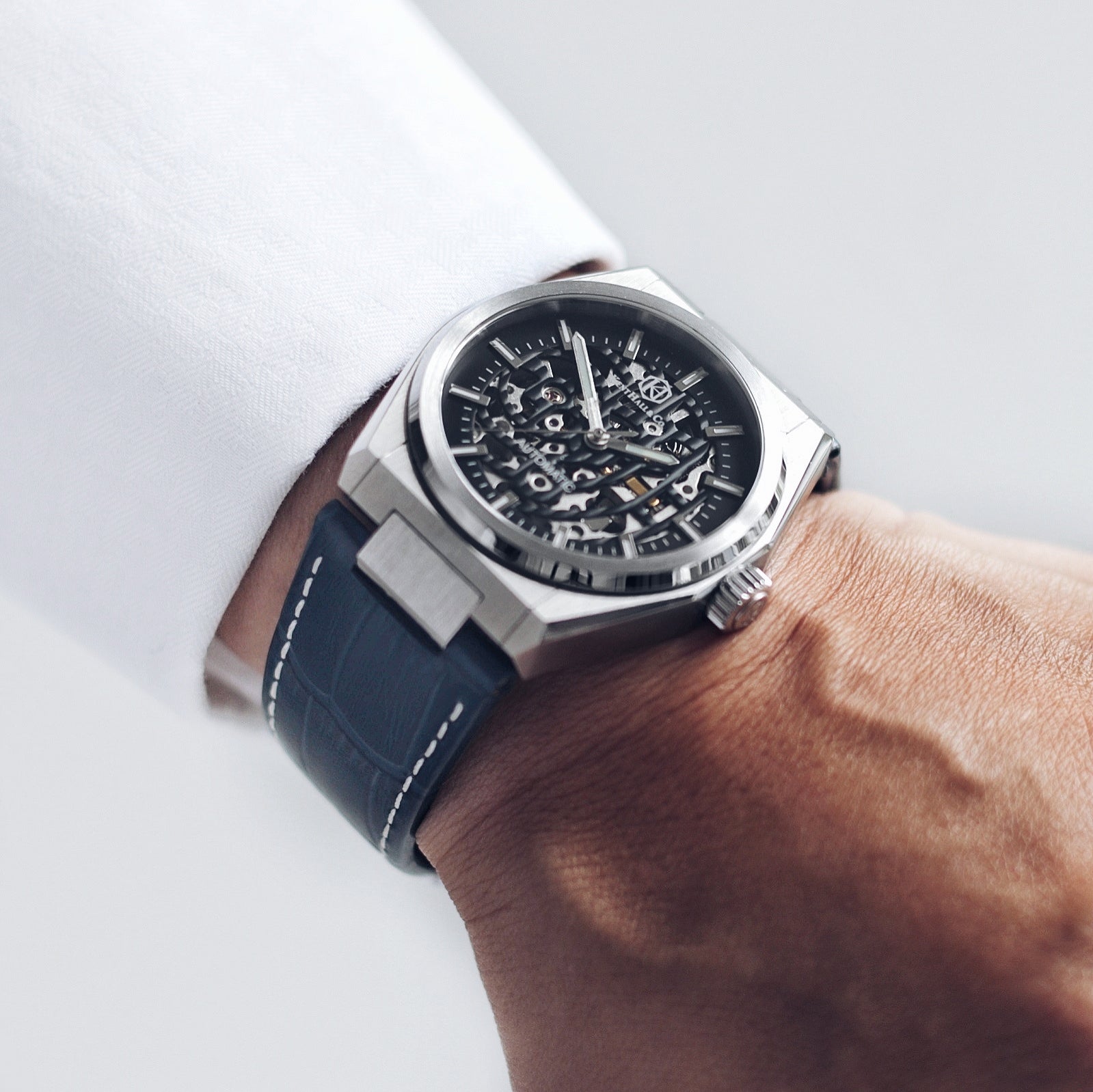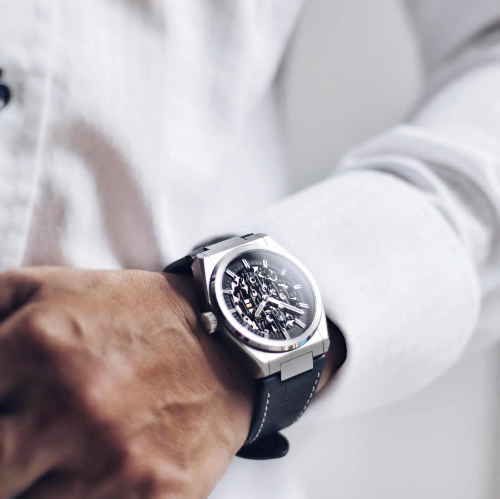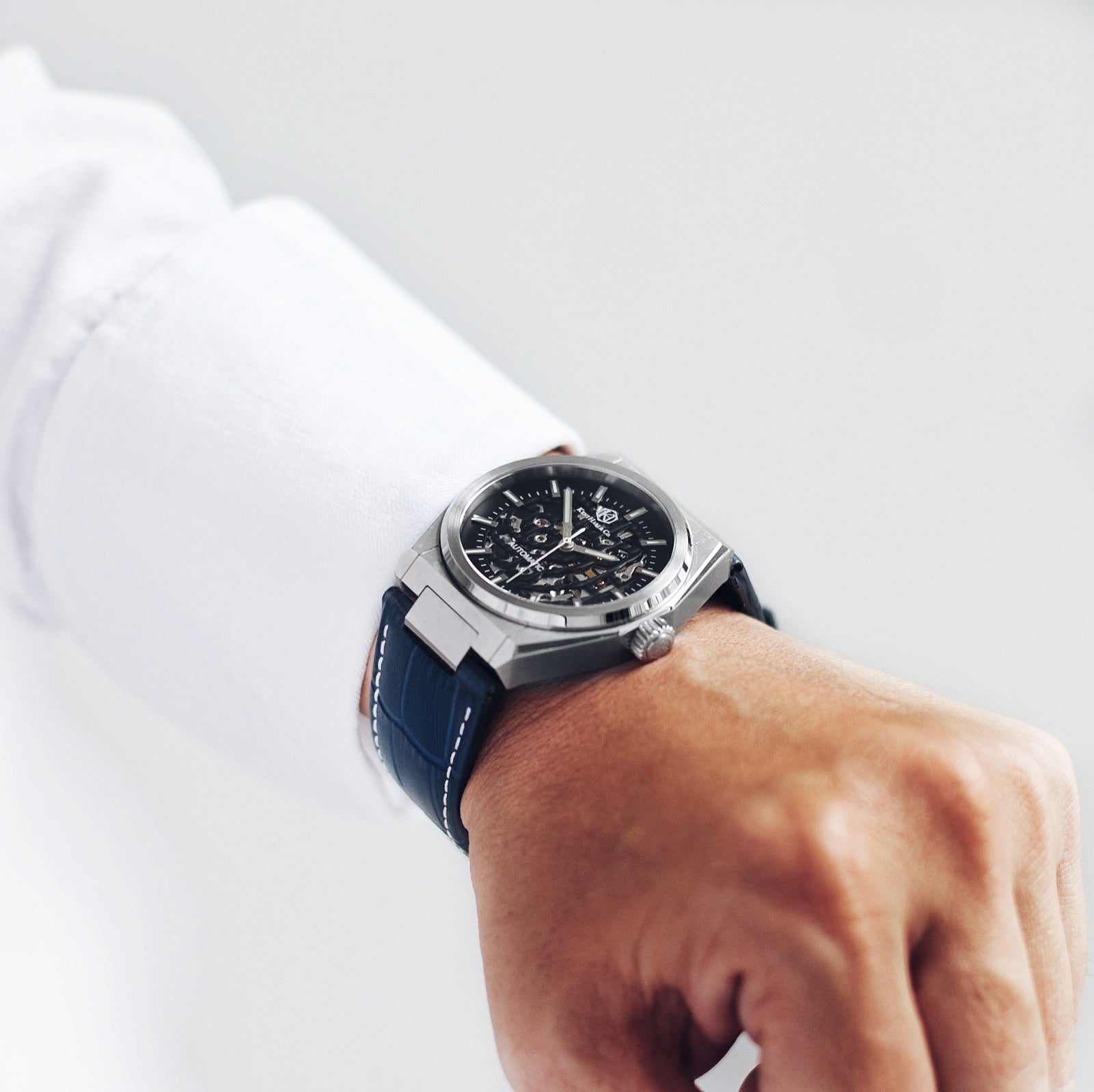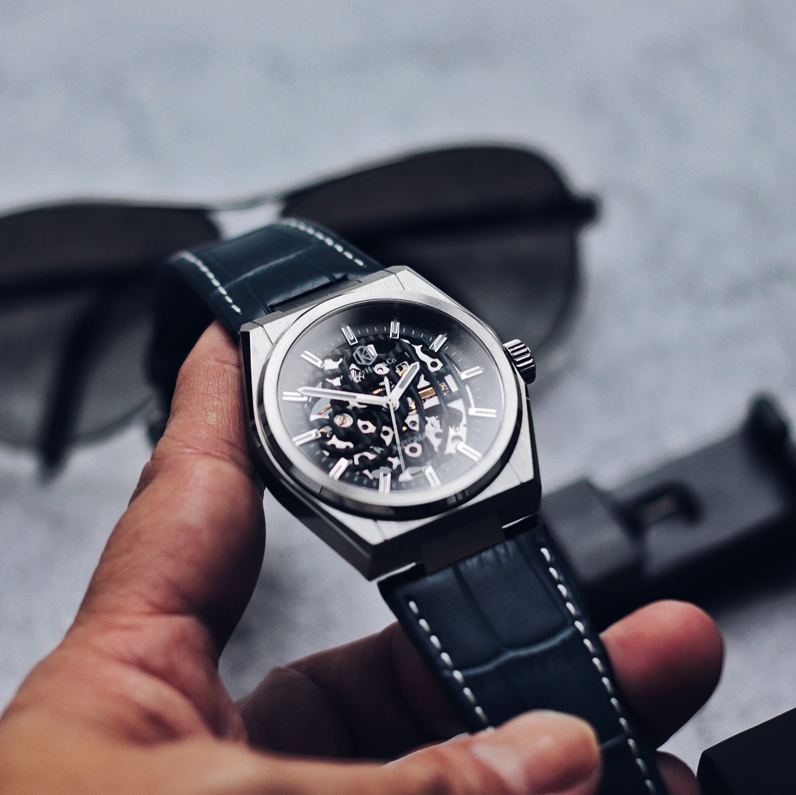 The Roman - Blue Leather watch features a striking skeleton dial, encased in 316L stainless steel case and matched with a blue leather strap with deployant buckle. Part of the Nova Skeleton series, the timepiece is powered by an automatic movement with up to 36 hours of power reserve. The movement can be wound and is further powered by your kinetic movements such that you will never need to change batteries. Protected by 10 ATM water resistance and topped with ultra scratch-resistant sapphire crystal glass, this statement piece is a pleasure to behold.