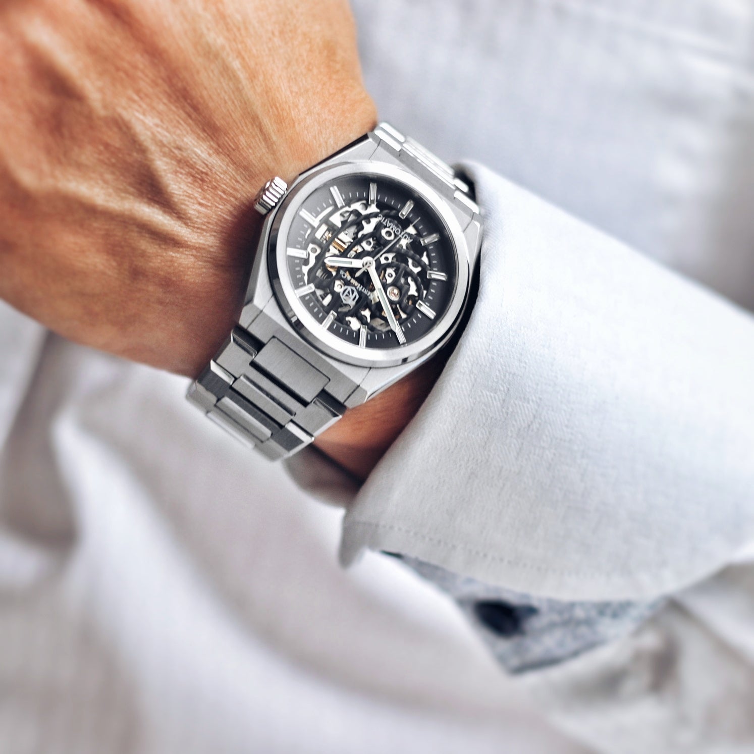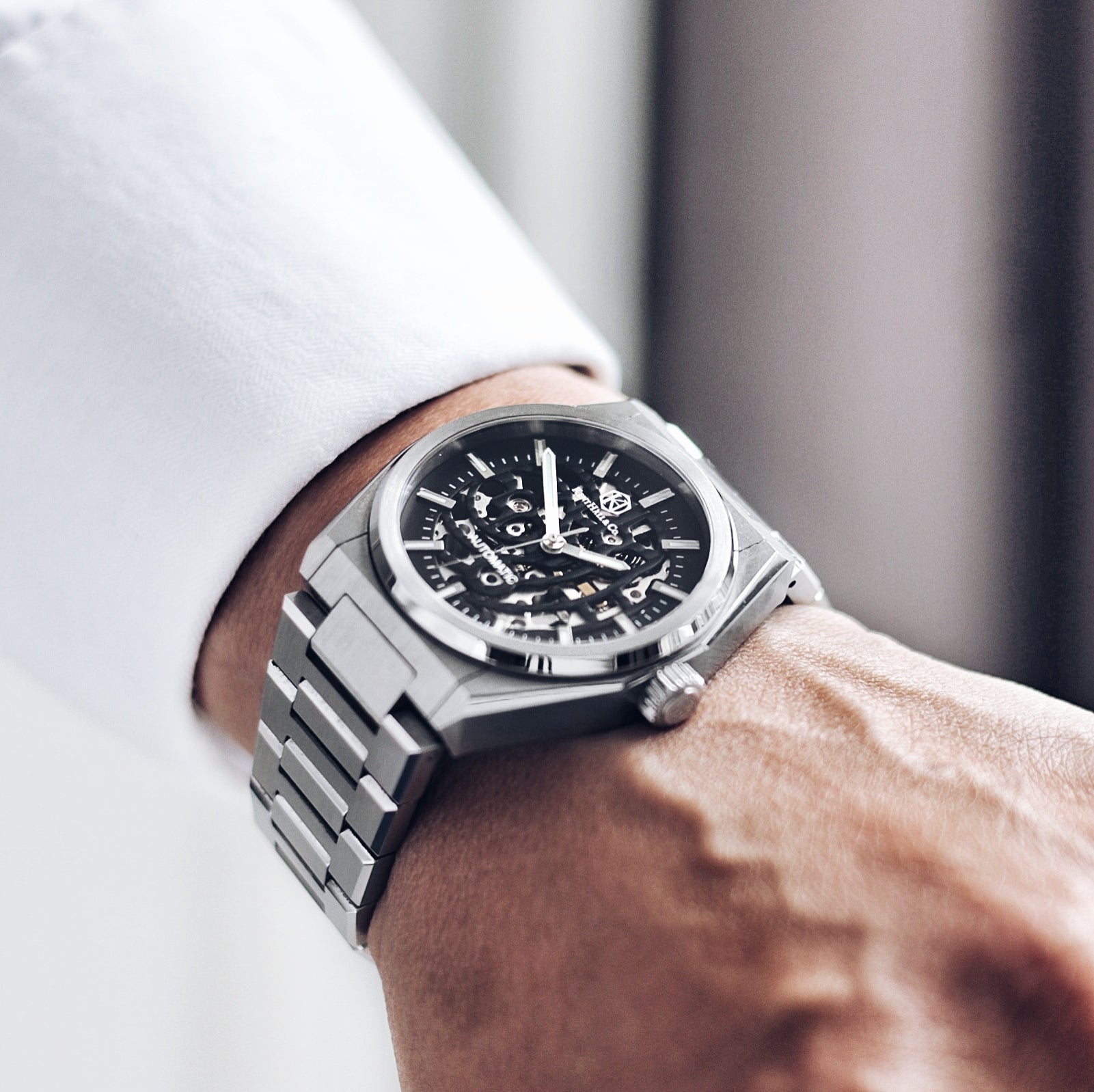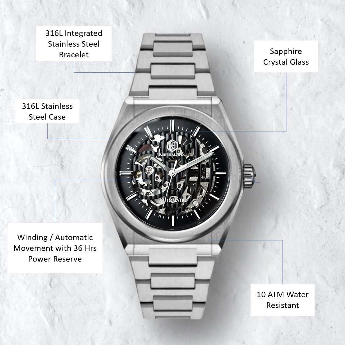 The Roman Steel watch features a striking skeleton dial, encased in 316L stainless steel case and matched with a clean metal bracelet. Part of the Nova Skeleton series, the timepiece is powered by an automatic movement with up to 36 hours of power reserve. The movement can be wound and is further powered by your kinetic movements such that you will never need to change batteries. Protected by 10 ATM water resistance and topped with ultra scratch-resistant sapphire crystal glass, this statement piece is a pleasure to behold.