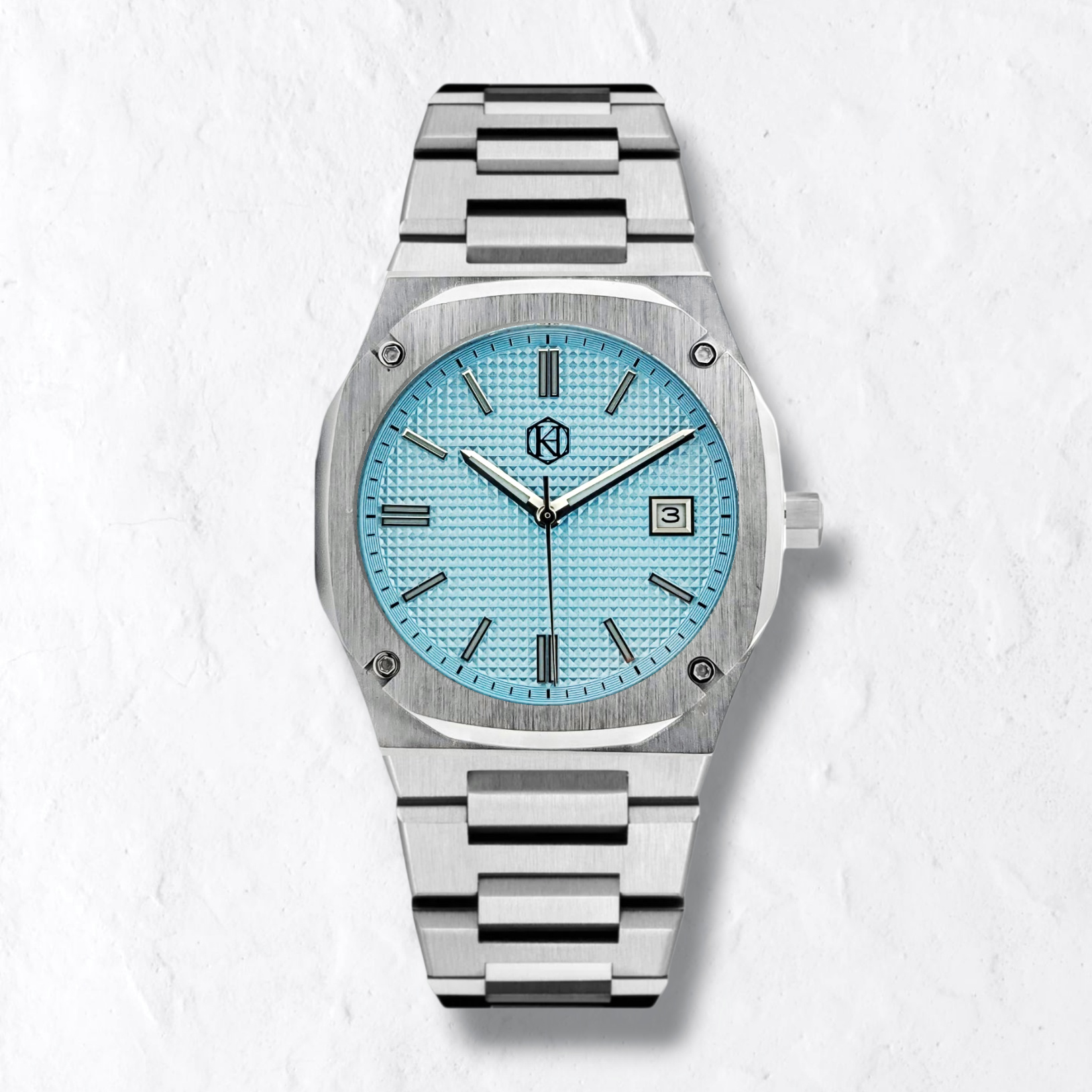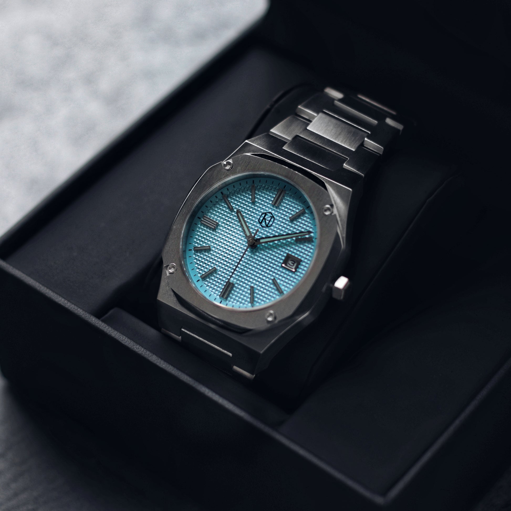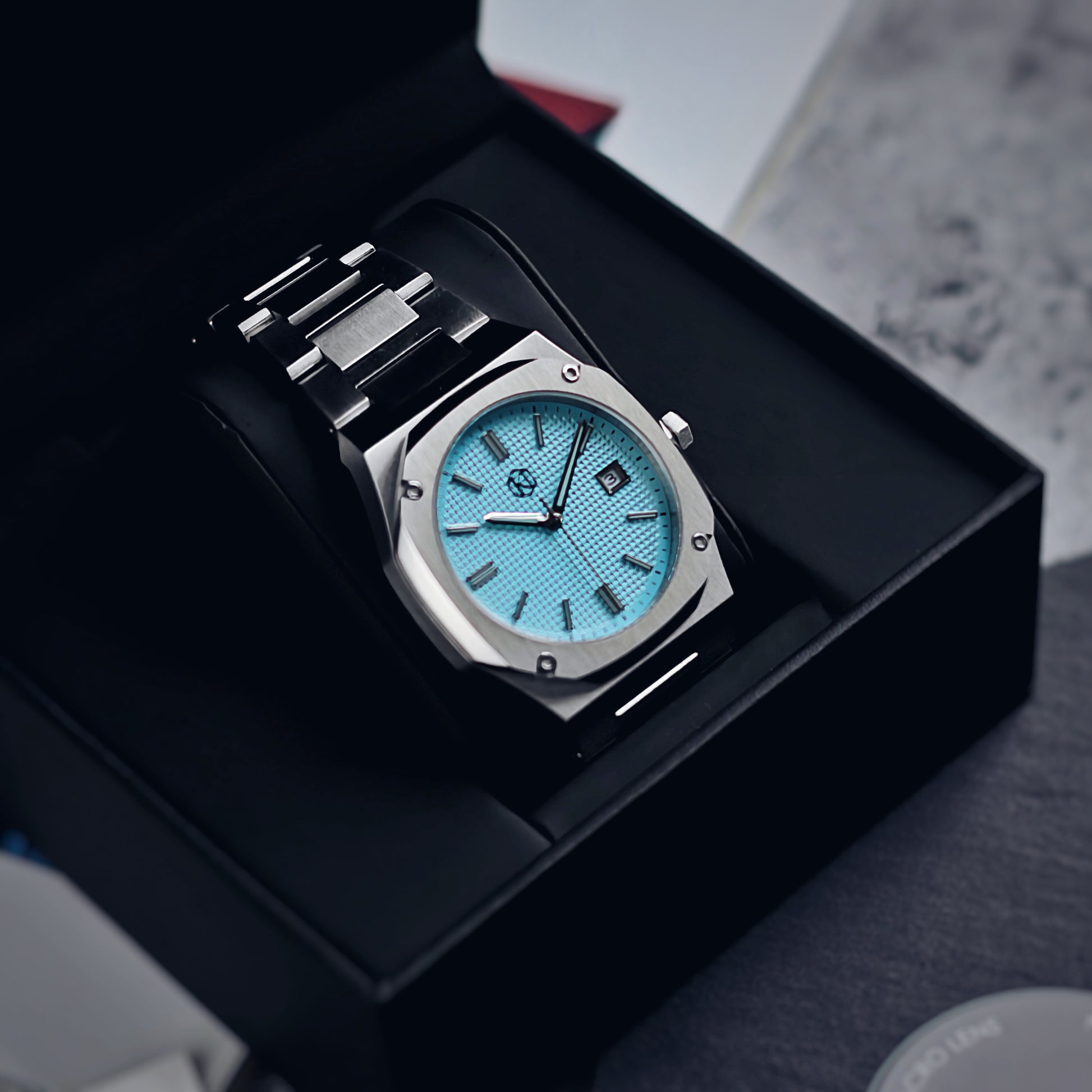 The light blue luminescence on the hands and indices imparts a stunning elegance to the watch.